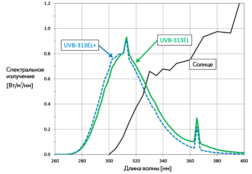 Важно! Спектральное распределение ламп UVB-313EL+ немного отличается от ламп UVB-313EL.