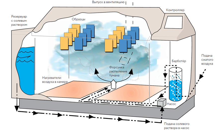 Типовым методом испытания является в настоящее время чередование воздействия на образцы солевого тумана, высокой влажности, низкой влажности, сушки и выдерживания при комнатной температуре. Во время сушки воздушный нагреватель поддерживает заданную температуру воздуха. Влажность в камере солевого тумана понижается, что обеспечивает сушку образца. Нагреватель можно и отключить, тогда воздух поступает в камеру при комнатной температуре